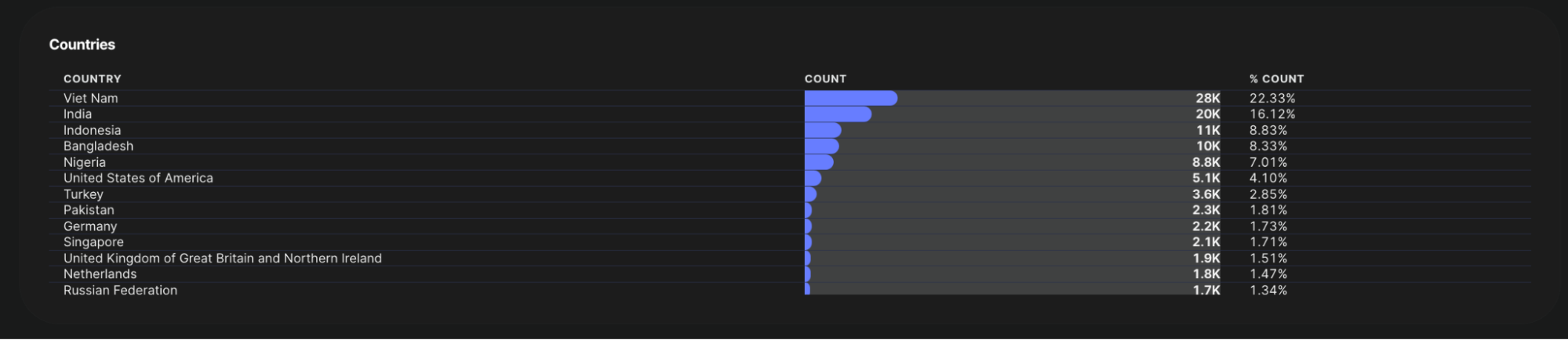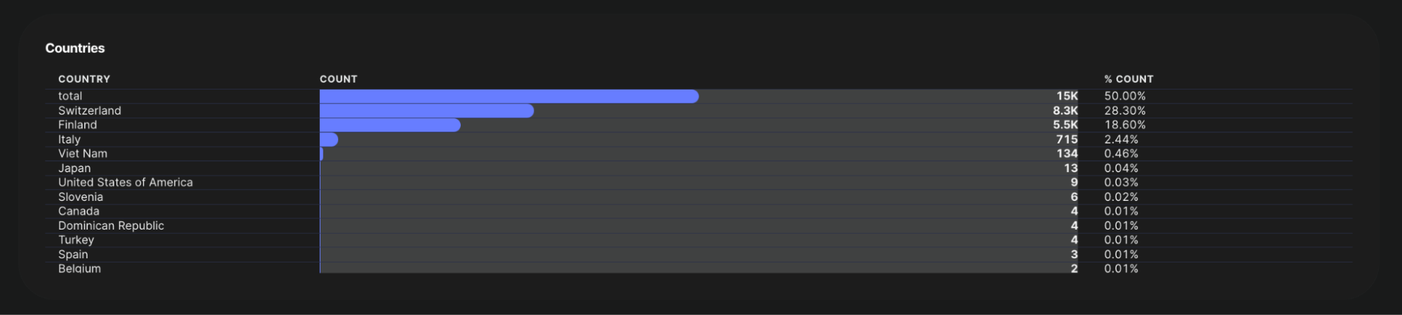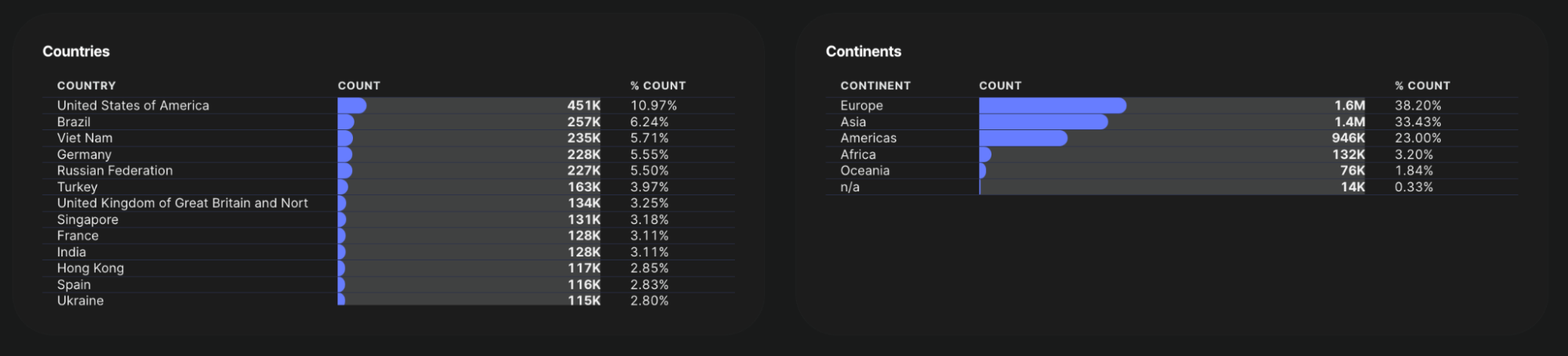 Provides insights into user connections by displaying the countries and continents with the most connections.