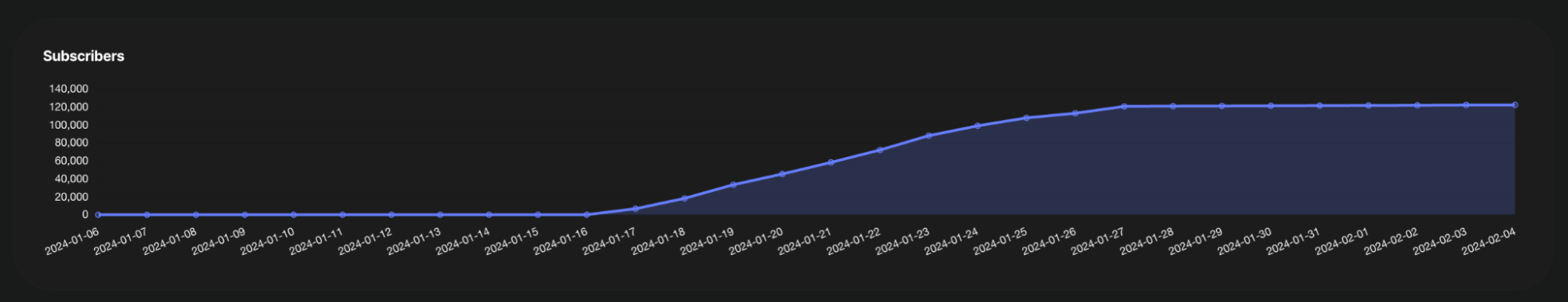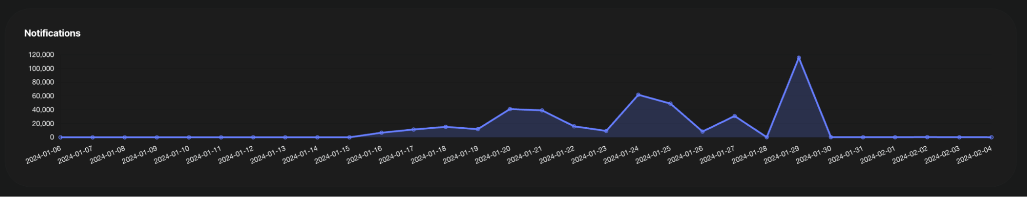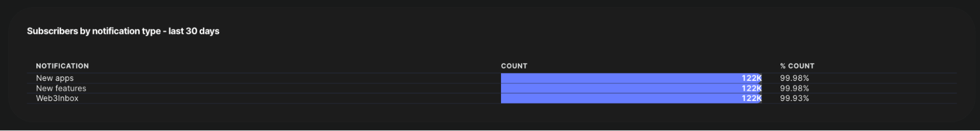 This table shows the total count of subscribers by notification type over a 30 day period.
