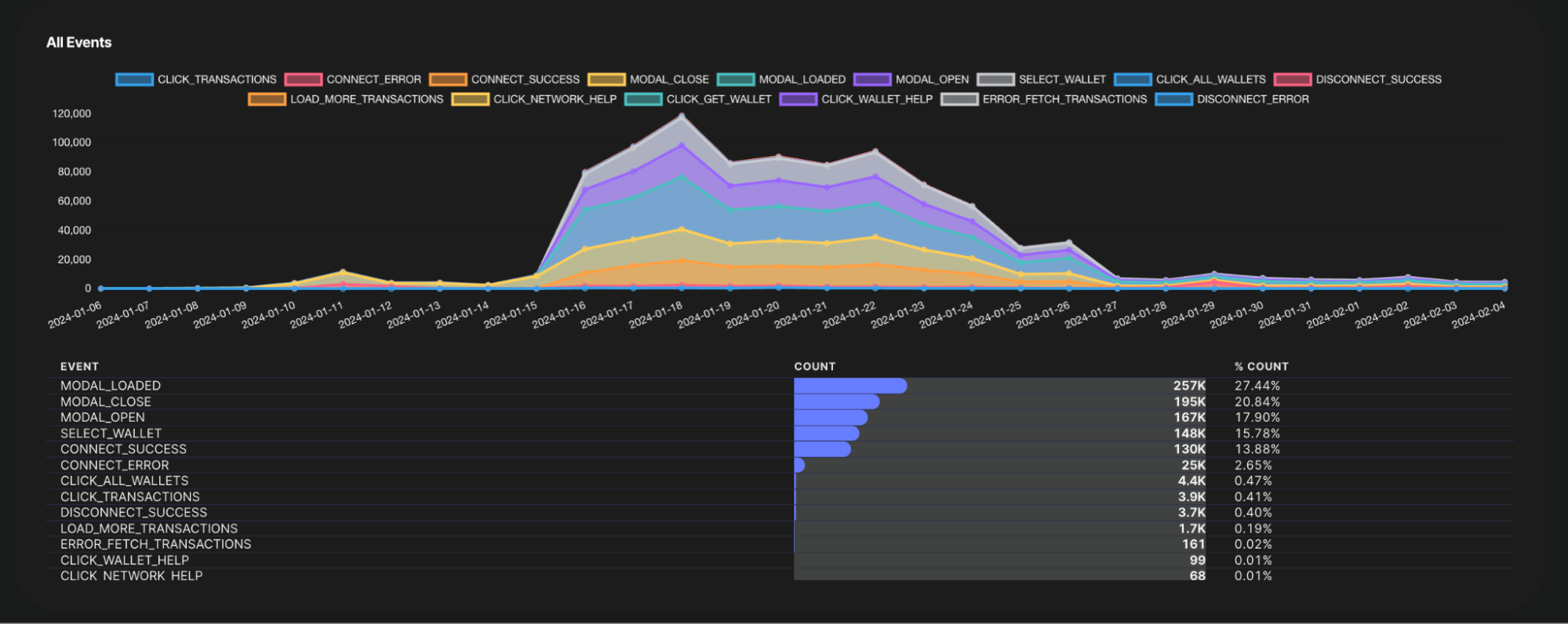 This table and chart shows the count of various events that are triggered as the users interact with AppKit.