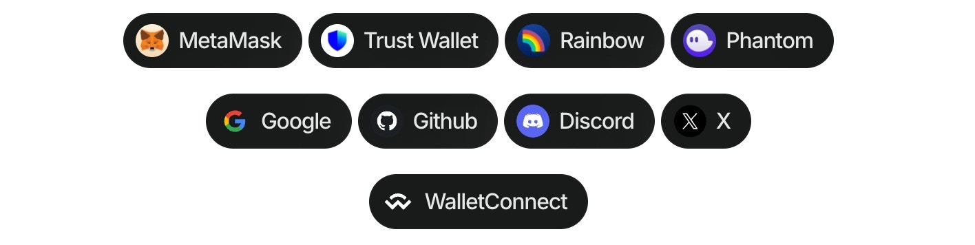 | Wallets | metamask, trust, coinbase, rainbow, jupiter, solflare, coin98, magic-eden, backpack, frontier, xverse, okx, bitget, leather, binance, uniswap, safepal, bybit, phantom, ledger, timeless-x, safe, zerion, oneinch, crypto-com, imtoken, kraken, ronin, robinhood, exodus, argent and tokenpocket |